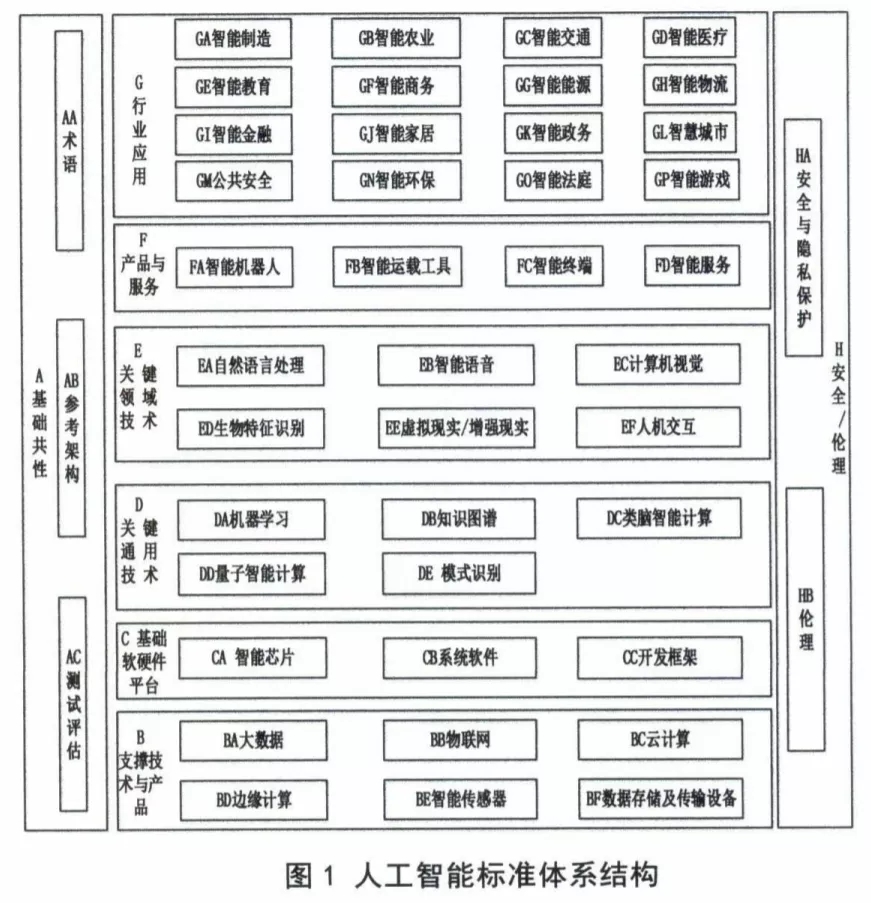 《指南》指出,人工智能标準體系結構包括 “A基礎共性”、“B支撐技術與産品”、“C基礎軟硬件平台”、“D關鍵通用技術”、“E關鍵領域技術”、“F産品與服務”、“G行業應用”、“H安全/倫理”等八個部分。