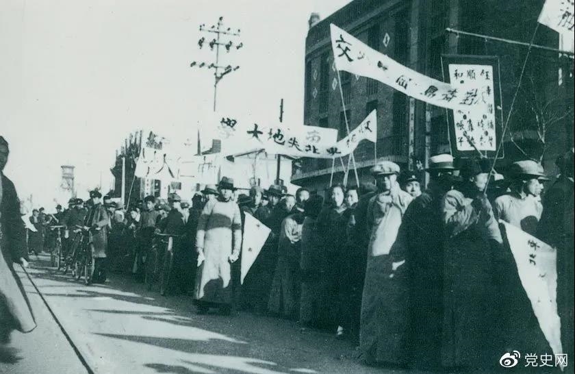 1935年12月9日,中國共産黨領導北平學生掀起聲勢浩大的抗日救亡運動,并迅速波及全國,形成抗日救國的新高潮。圖為遊行隊伍。