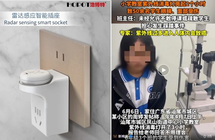 随着健康安全意识的提升,紫外线消毒灯在学校、幼儿园、医院,食堂等公共场所的应用越来越广泛。然而,强烈的紫外线光线也会对人体造成极大的伤害,因此安全使用显得尤为重要。最近有新闻报道,某小学教室因紫外线消毒灯未及时关闭而导致50余名学生眼睛和面部受伤的安全事故,引发了社会对此类设备安全性的高度关注。其实,这种现象是完全能够避免的。为了防止类似事件的再次发生,浩博特公司最新推出了一项新的解决方案,即全新研发的紫外灯专用定时雷达感应插座。
