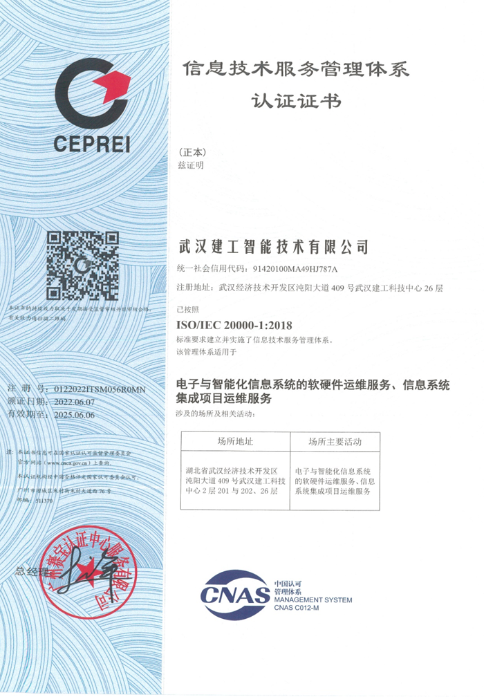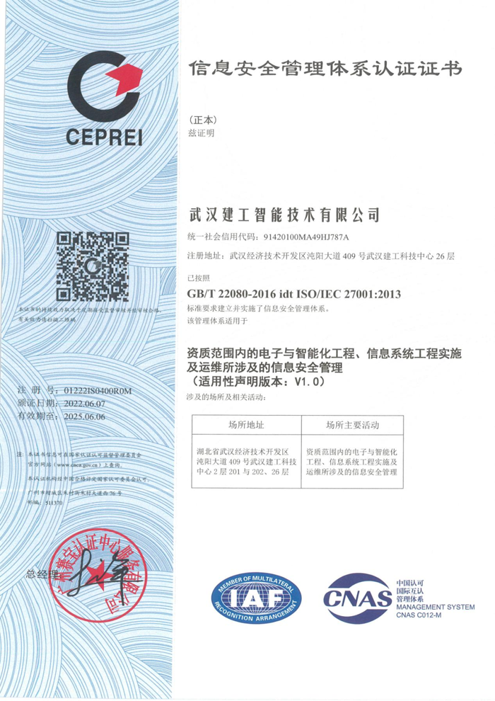 近日,協會理事單位武漢金年会智能技術有限公司喜報頻出,經過公司上下共同努力,順利獲得了“信息安全管理體系認證證書(ISO27001)、信息技術服務管理體系認證證書(ISO20000)、信息系統建設和服務能力等級證書(CS1)、信息技術服務标準符合性證書(ITSS3)”,标志着公司在信息安全管理、信息技術服務、信息系統建設等方面獲得了國家權威機構的認可,公司綜合競争實力得到顯著提升