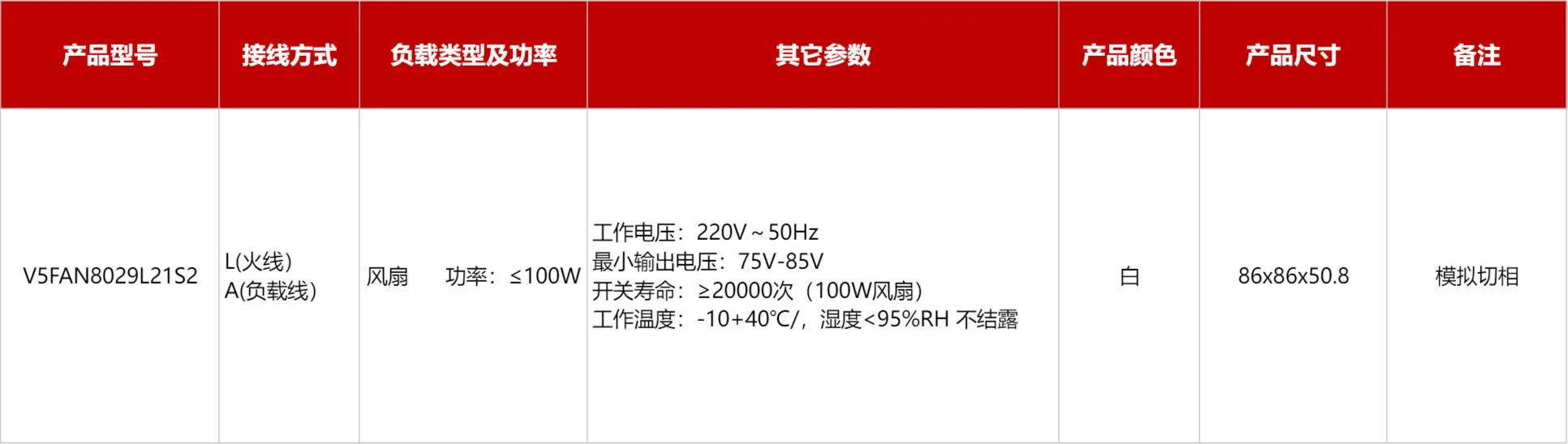 调速开关(100瓦) 产品型号:V5FAN8029L21S1